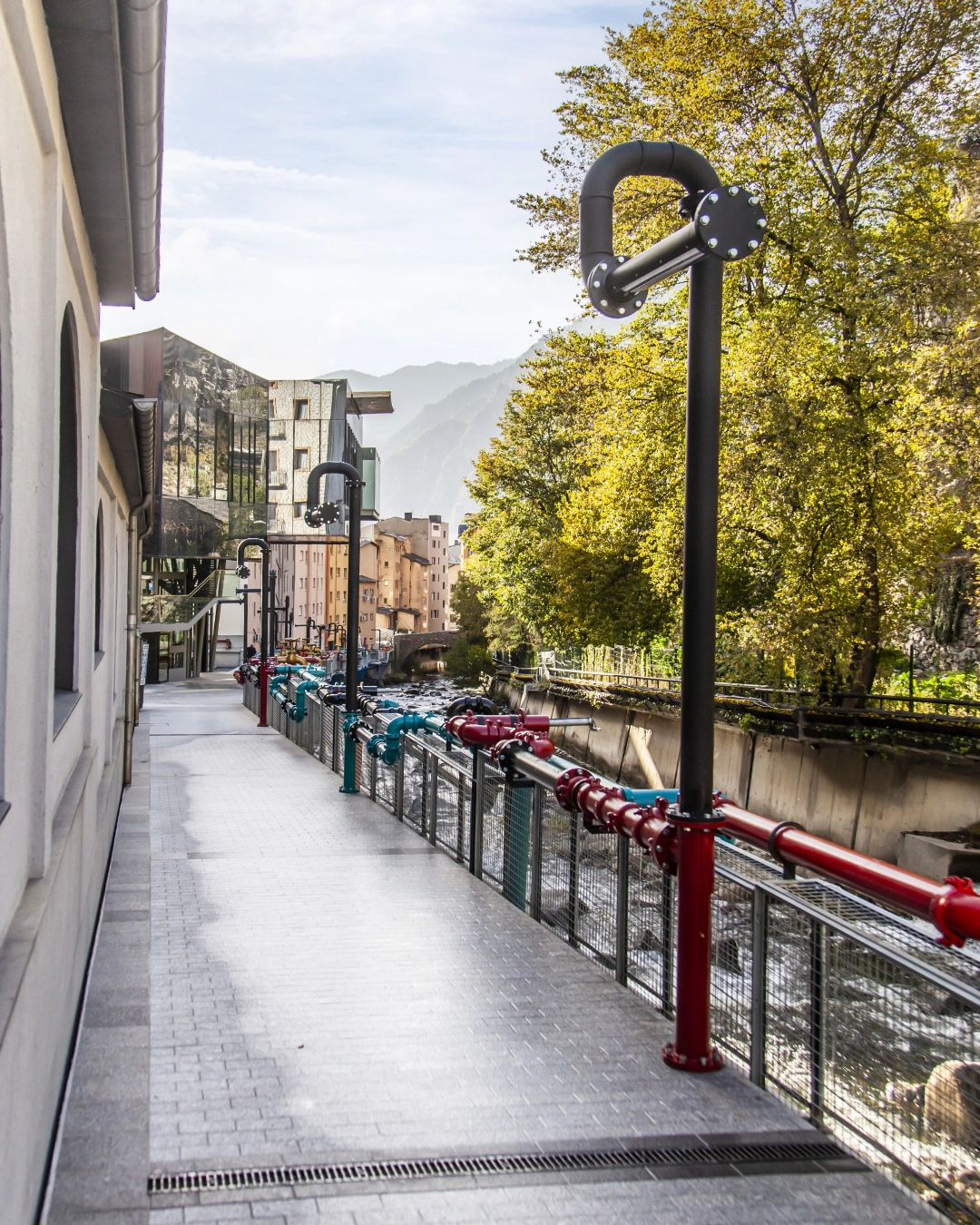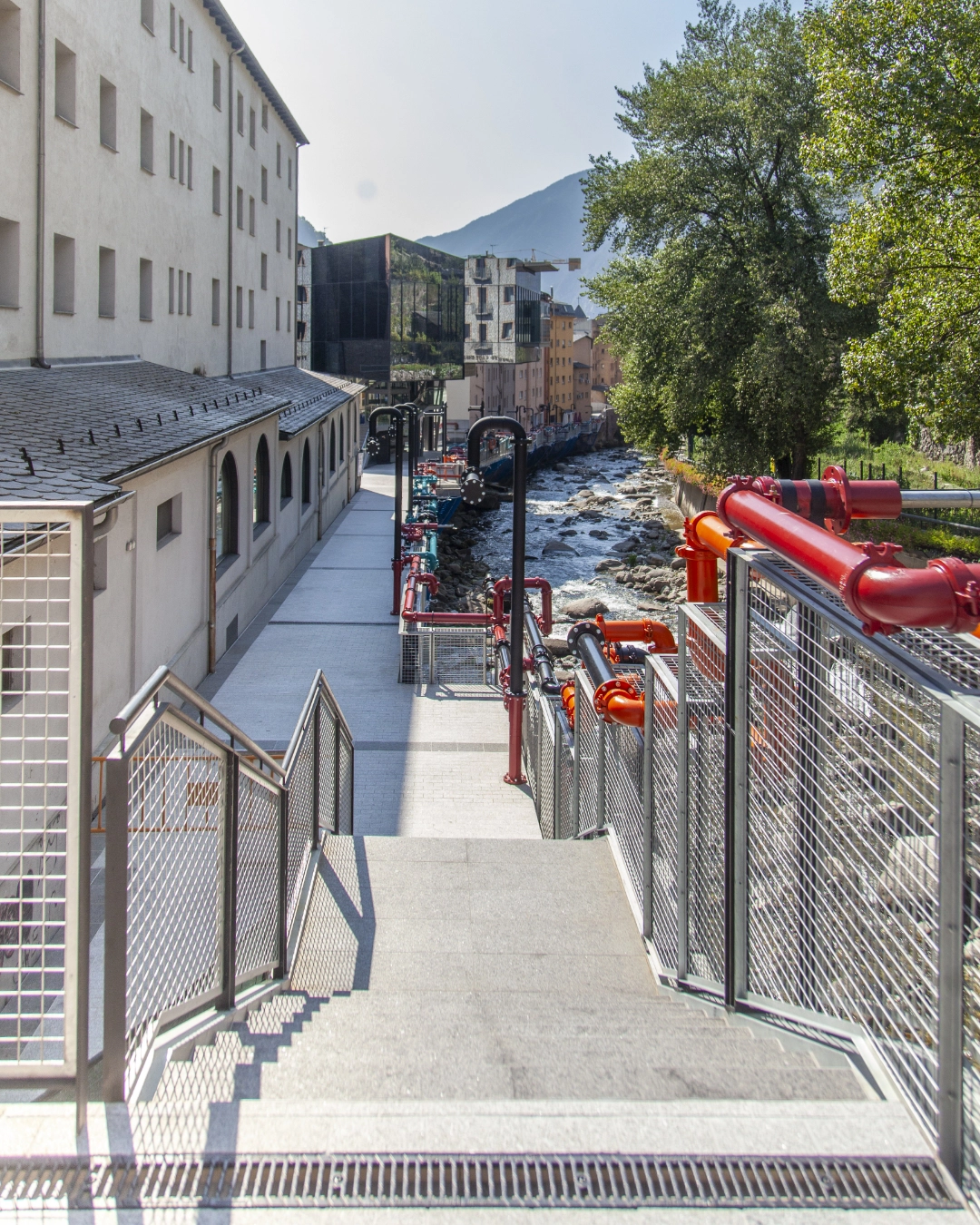 Tot i partir d’un model tridimensional, el vam adaptar als nostres sistemes constructius i vam resoldre diversos reptes amb solucions a mida, respectant el disseny artístic original. La fabricació es divideix entre una estructura metàl·lica elaborada al taller i elements singulars instal·lats in situ, com les baranes de gabions metàl·lics, muntades amb precisió mil·limètrica.