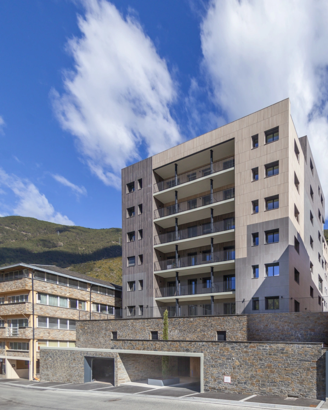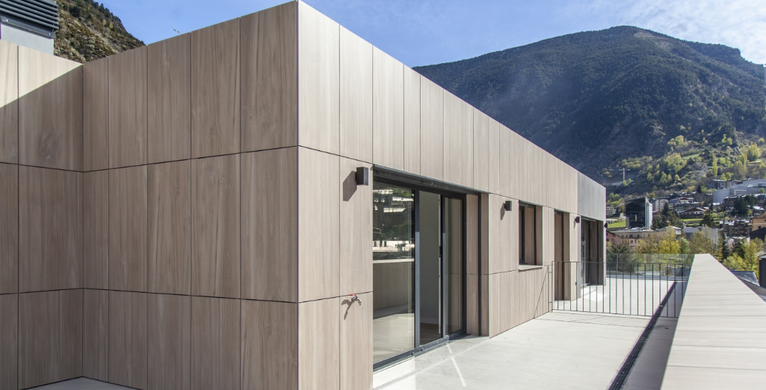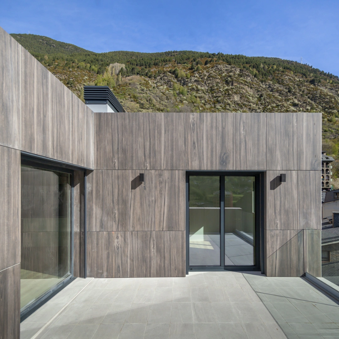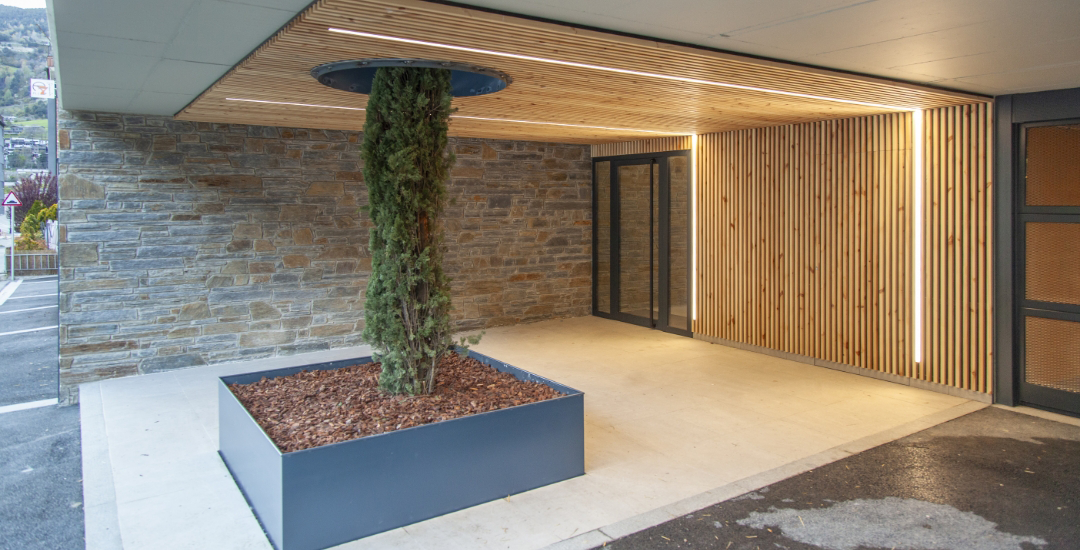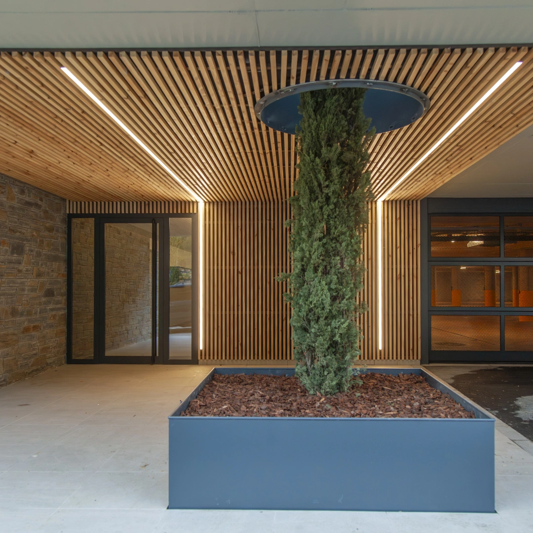 Projecte que es destaca pel desenvolupament d’una façana ventilada que combina eficiència energètica i integració paisatgística. Aquesta s’ha executat amb panells composite amb acabats que imiten textures de fusta clara, fusta fosca i pedra, aconseguint un efecte visual equilibrat i natural.