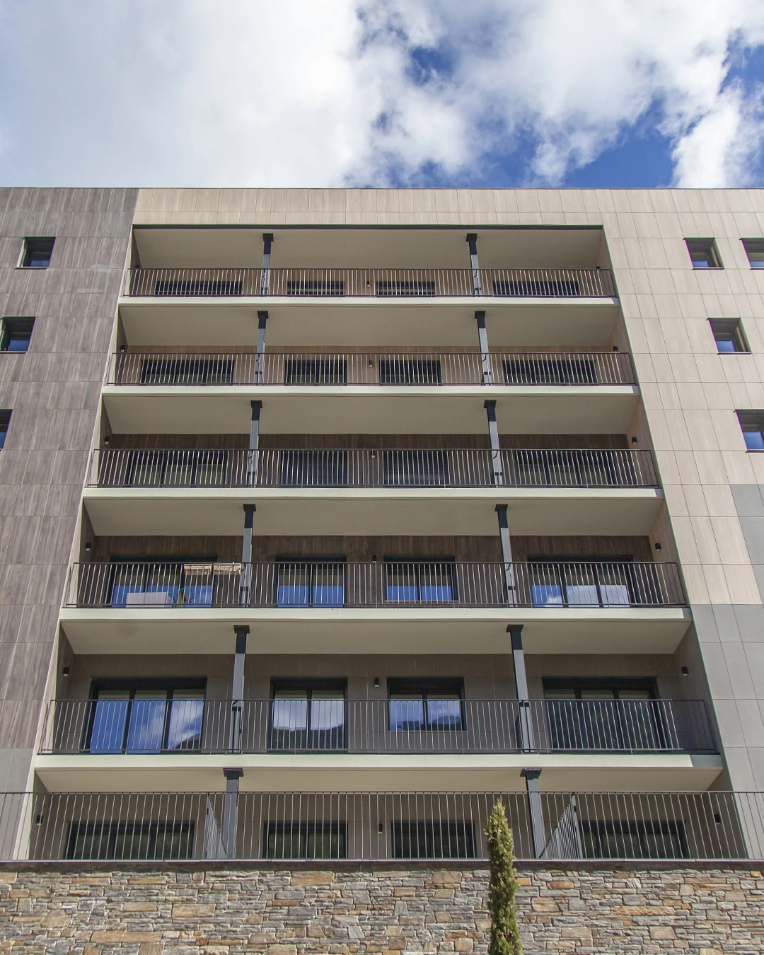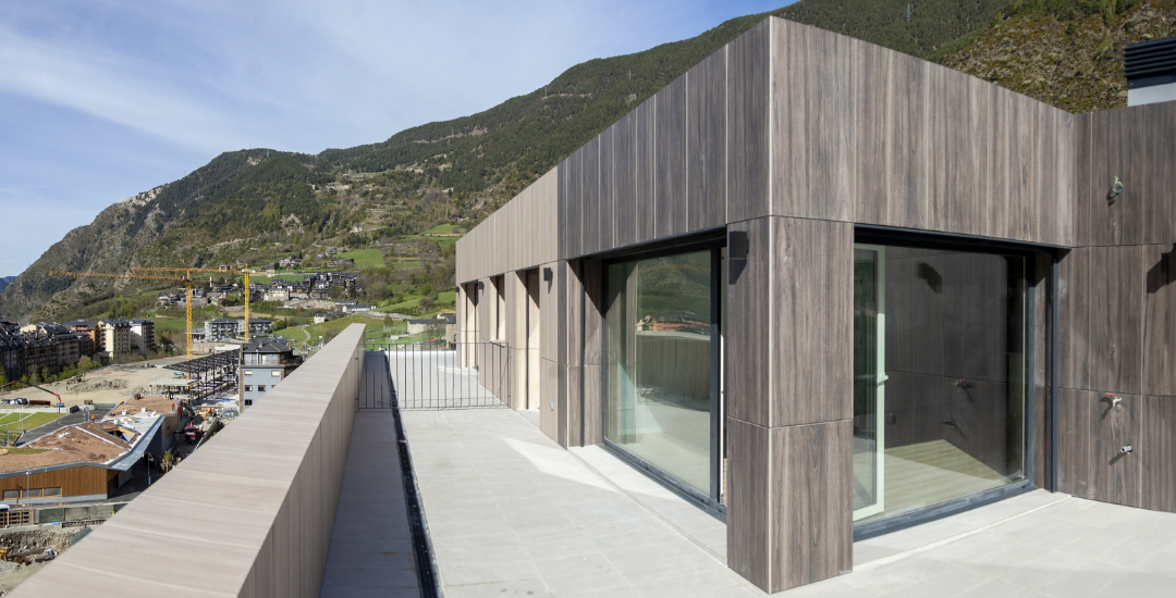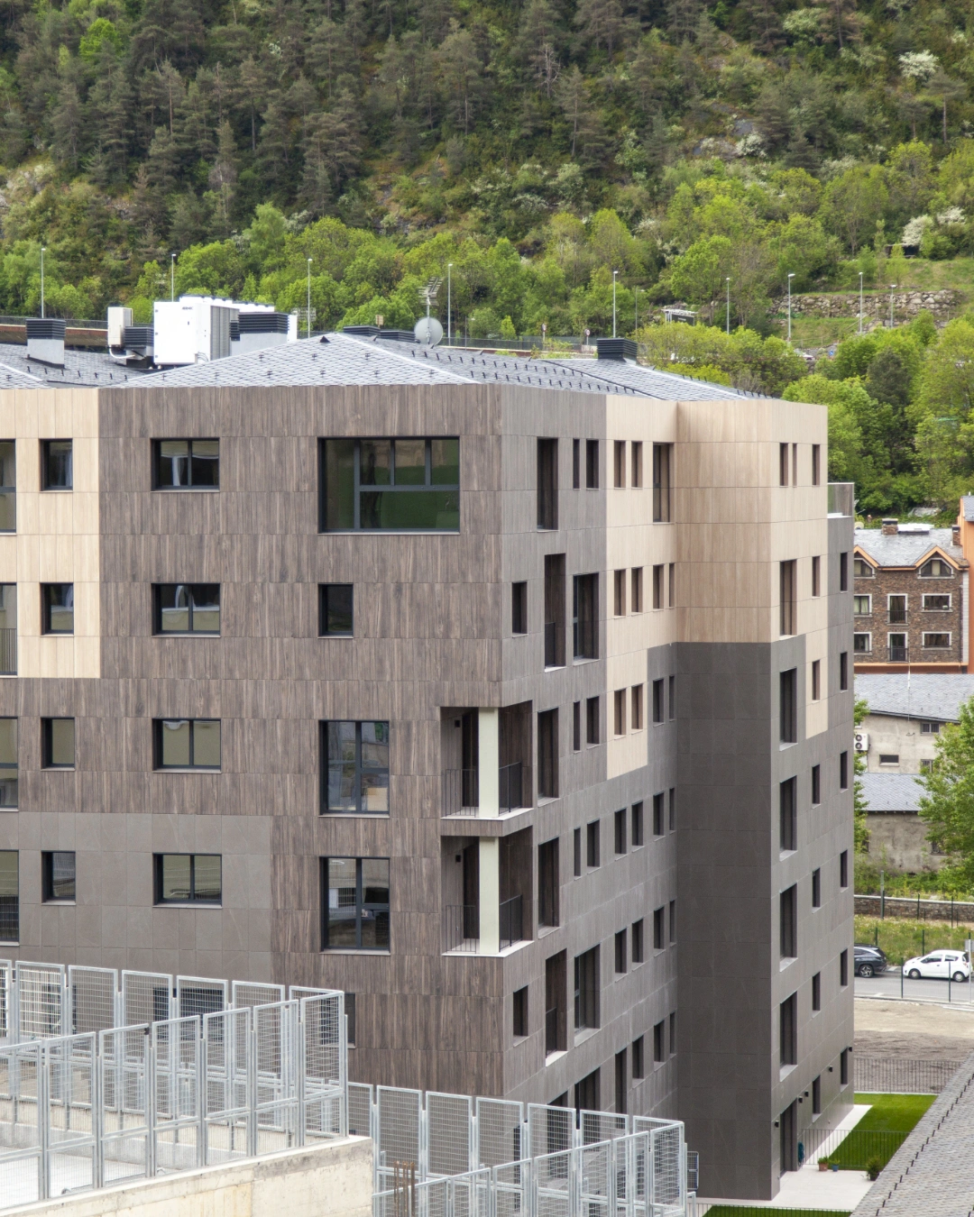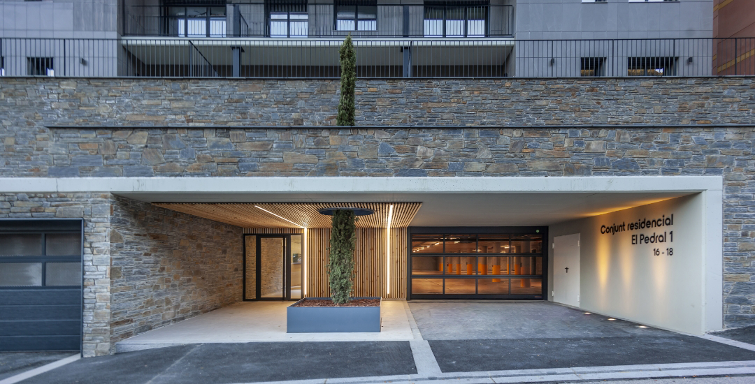 Projecte que es destaca pel desenvolupament d’una façana ventilada que combina eficiència energètica i integració paisatgística. Aquesta s’ha executat amb panells composite amb acabats que imiten textures de fusta clara, fusta fosca i pedra, aconseguint un efecte visual equilibrat i natural.
