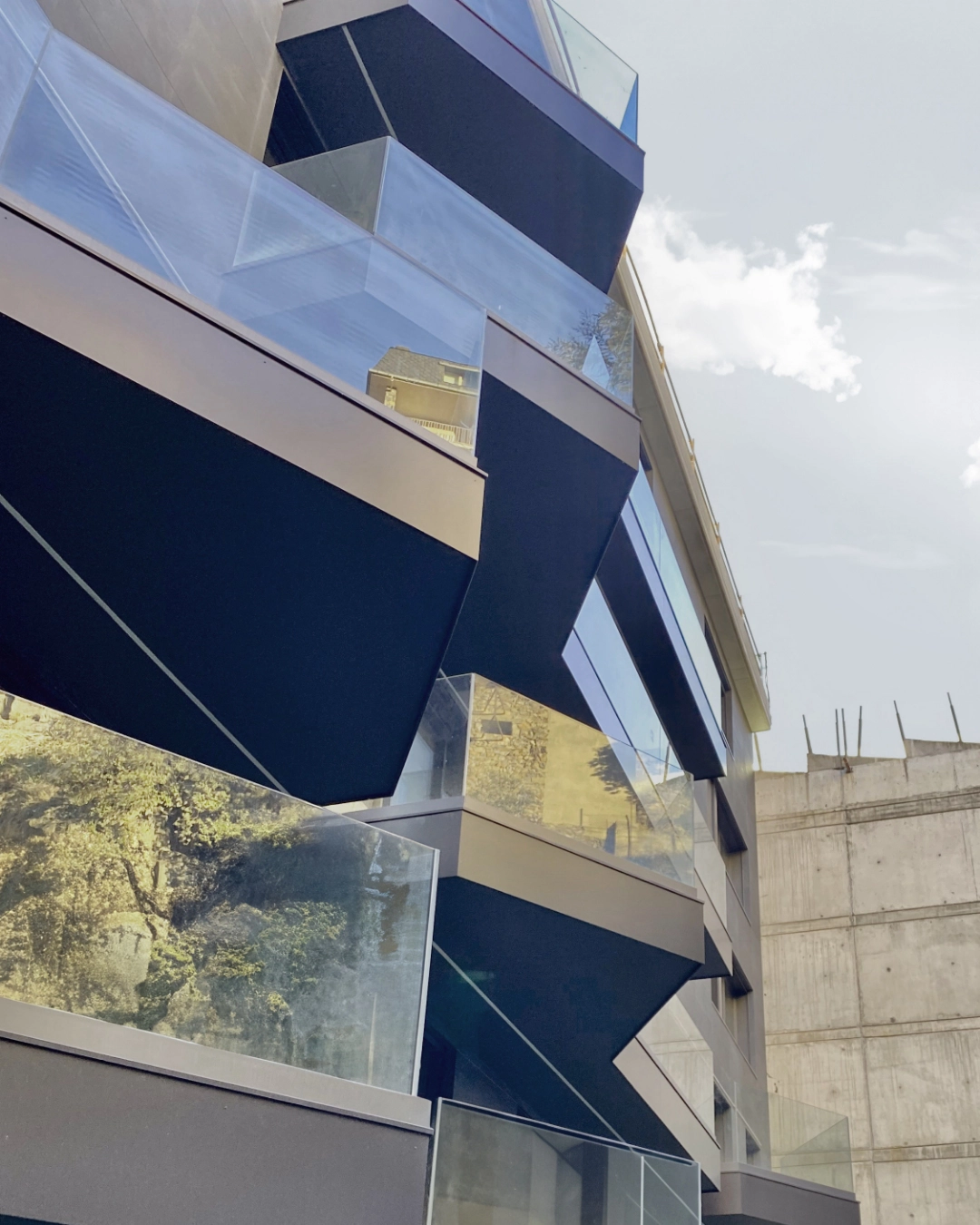 Aquesta solució tècnica contribueix a la creació d’una façana dinàmica, amb jocs volumètrics que trenquen amb la rigidesa tradicional, aportant moviment, funcionalitat i personalitat al paisatge urbà del centre històric d’Andorra la Vella.