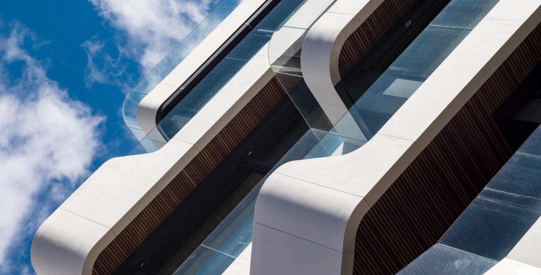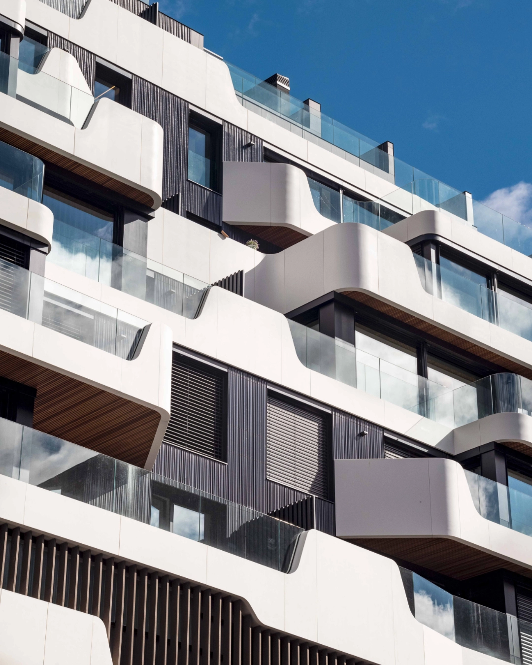 La façana principal combina materials amb textures brillants i mates, creant contrastos visuals atractius i una imatge rica en matisos. Amb formes arrodonides, grans obertures i un disseny que recula cap a l’interior, l’edifici adquireix una arquitectura singular, fluida i lluminosa, on cada detall ha estat concebut per oferir una experiència visual i espacial única.